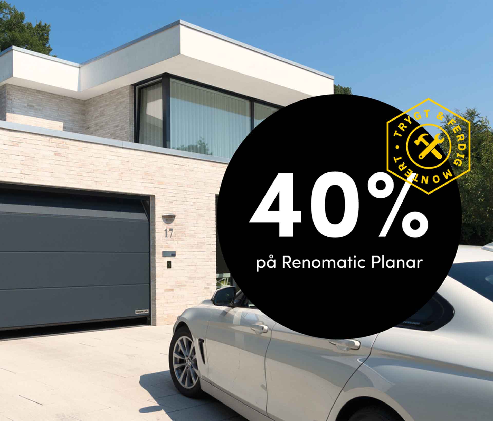 Nå har vi et eksklusivt tilbud du ikke vil gå glipp av. Vi gir hele 40 % rabatt på garasjeporten RenoMatic Planar Matt Delux fra Hörmann en moderne og slitesterk port som passer til alle hjem,